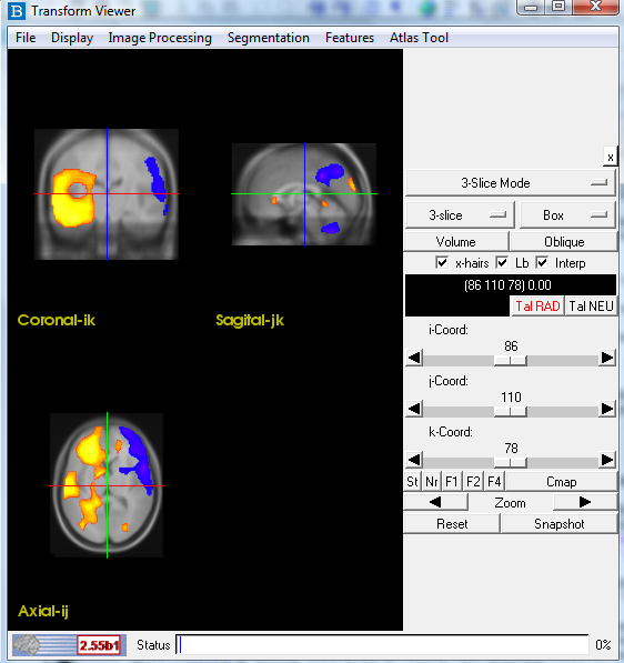 - The transform viewer should now show the Perfusion Blobs overlayed on to the Template MRI.