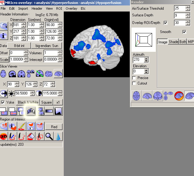 - Specify More for brightness of blobs, and you'll have perfusion contrasts overlayed on a template brain. However, the problem with this is the orientation of the contrasts are flipped (left is right, right is left).