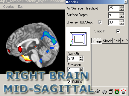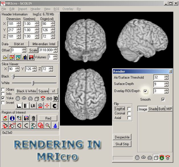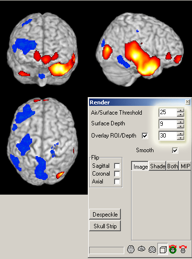 - You should see a 3D brain in 3 different planes. In the Render window that should have appeared, click the Overlay ROI/Depth box.